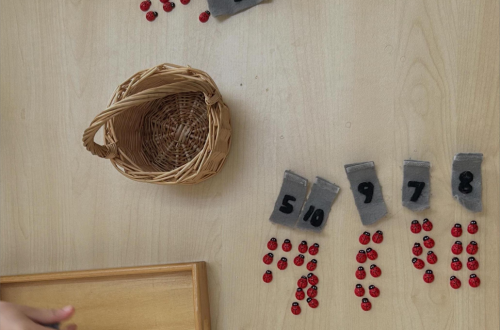 Sandpaper Numerals dan Red rods kenalkan serentak tapi asing. Sandpaper numerals untuk kenal simbol satu, dua, tiga, number rods untuk quantity. Bila dah lepas kedua-dua ni baru associatekan simbol dengan kuantiti. Spindle box baru mula mengira satu-satu dan intro pada ‘0’. Zero game untuk kukuhkan konsep ‘0’, then cards and counters (odd & even) dan memory game. At least this is how I presented it to Hana dan Aqeel. Aqeel sekarang di number rods dan cards. Dia masih lagi tak menyusung ikut sequence sebab kurang susunan red rods, but that’s the difficulty I faced for homeschooling sebab dia sangatlah tak minat dengan red rods. ? tapi dia boleh susun number rods secara rawak dan letakkan simbol dengan betul.