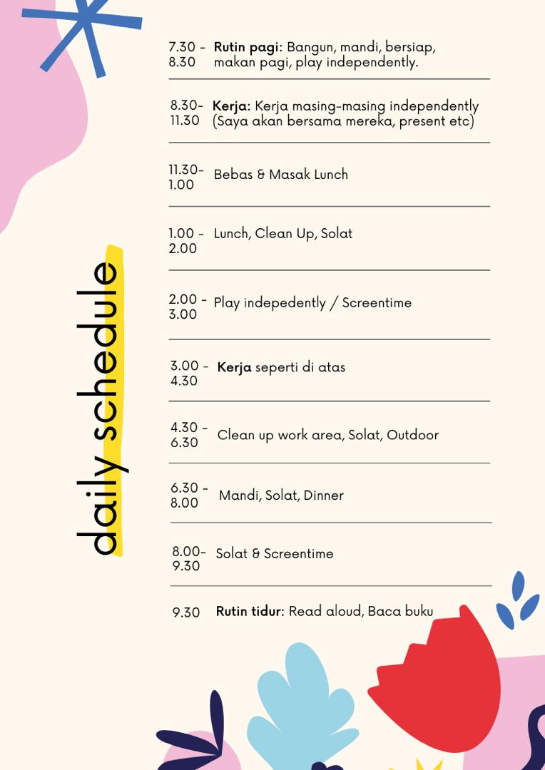 Kenapa saya panggil rutin bukan jadual? Sebab walaupun saya tulis masa, kami tak strictly follow juga. Ada hari mereka bangun lambat, contohnya pukul 9. Bangun, mandi makan pukul 10 lebih baru ready untuk waktu ‘kerja’. Fleksibel tapi masih ikut rutin. Jadual ni pada awal masa mula-mula buat memang saya kongsi dengan mereka dan what to expect.