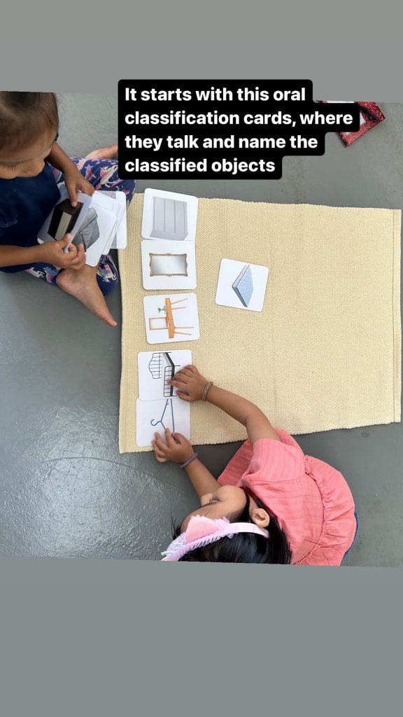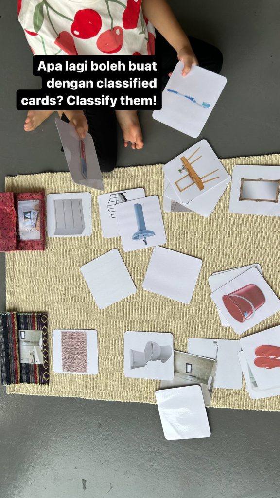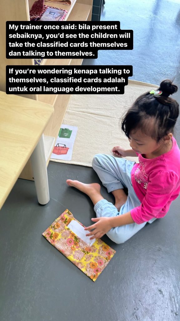 My trainer once said: bila present sebaiknya, you’d see the children will take the classified cards themselves dan talking to themselves.